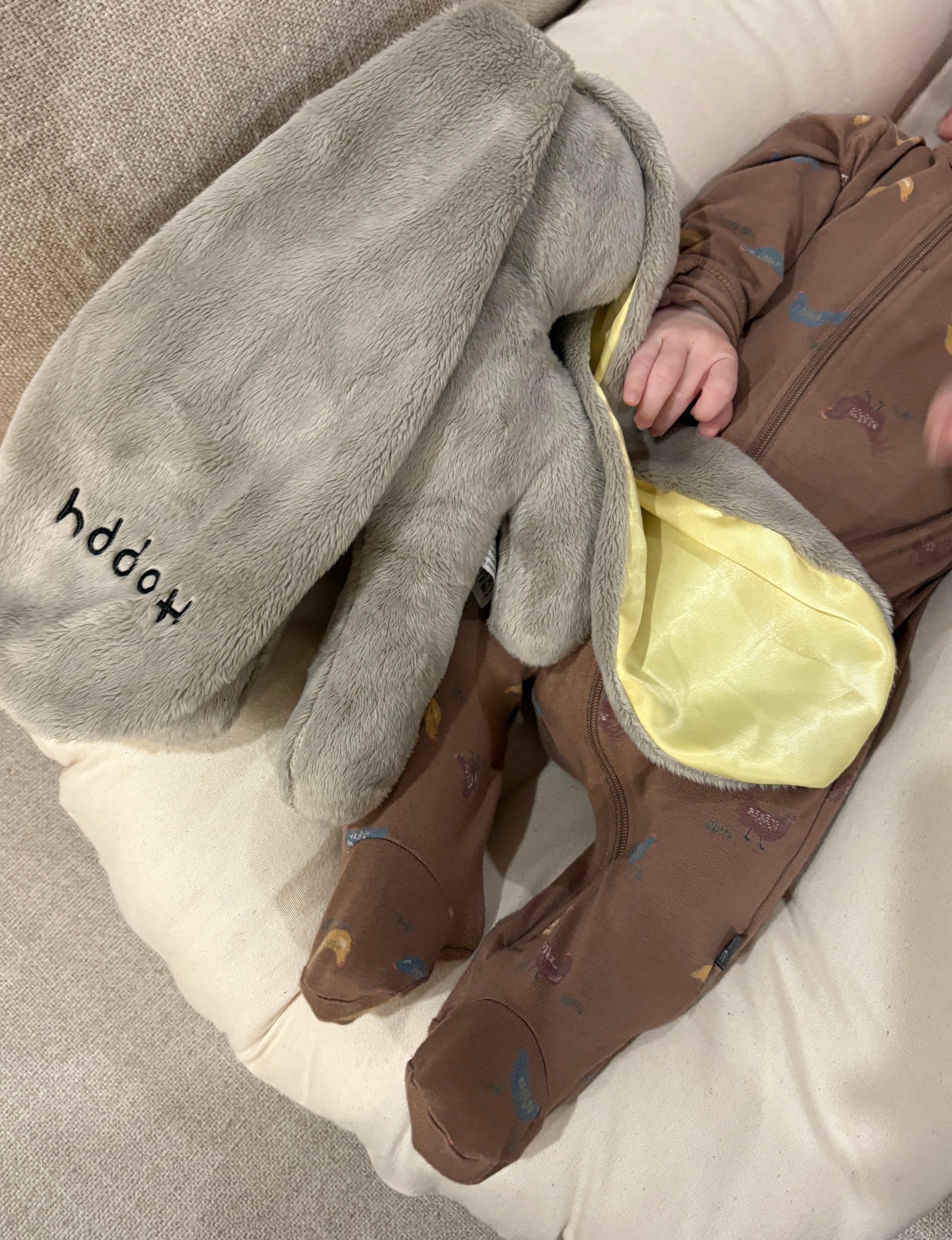Sunny Hoppy is a silky-soft lovey bunny designed to bring warmth, comfort, and joy wherever your baby goes. With cheerful yellow satin ears and a plush, huggable body, it’s made to brighten days, calm moments, and grow with your child — from first cuddles to big-kid adventures.